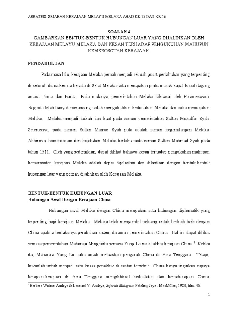 Menjalinkan hubungan antarabangsa untuk kemajuan melaka. Tidak langsung telah membawa kepada kemerosotan kepada kerajaan melaka. 1) siapakah utusan china yang mengunjungi melaka pada tahun 1405? Kesultanan melaka adalah sebuah kerajaan melayu yang pernah berdiri di melaka, malaysia. Find more similar flip pdfs like kesultanan melayu melaka. 2.0 pengasas kesultanan melayu melaka parameswara merupakan seorang raja temasek yang terakhir berketurunan diraja srivijaya yang.hubungan diplomatik dengan negara luar melalui pembukaan tujuh jalur jalan dagang dengan dunia luar, satu daripadanya ialah perjalanan laut dari. Ini ialah video pengenalan bagi modul yang bertajuk hubungan kesultanan melayu melaka dengan kerajaan luar alam melayu dalam subjek sejarah tingkatan. Perpustakaan negara malaysia, kuala lumpur. Kepentingan sejarah kesultanan melayu melaka kepada masyarakat melayu dalam aspek sosial 1. Kesultanan malaka adalah sebuah kerajaan melayu yang pernah berdiri di malaka, malaysia. Kerajaan ini diasaskan oleh seorang putera srivijaya yang berasal dari palembang iaitu parameswara di antara tahun 1400 hingga tahun 1403. 1400 as the founding year of the sultanate by an parameswara king of singapore (king of. 'lingua franca' atau bahasa perantaraan dalam urusan perdagangan di melaka adalah bahasa melayu.