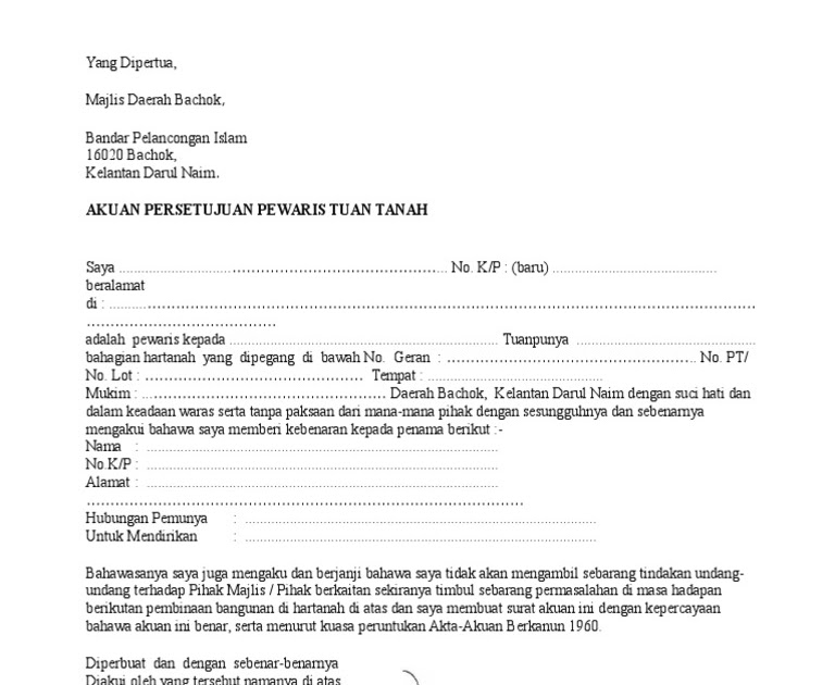 Documents similar to surat kebenaran menggunakan tanah. Biasanya surat ini dilengkapi dengan materai sebagai penguat kepercayaan dan agar terlihat kredibel. terkini contoh surat rasmi kebenaran bekerja daripada majikan yang perlu ditunjukkan kepada polis/roadblock ketika pkp atau pkpb. Akuan sumpah kebenaran yang lengkap (melalui pesuruhjaya sumpah berstem) dari pemilik tanah sekiranya tanah. Di bawah ini ada contoh surat keterangan hibah tanah yang bisa anda jadikan referensi untuk keperluan anda. Berikut adalah contoh surat kuasa beli tanah yang sering terjadi di level perusahaan ,full description. Tuan/puan, kebenaran untuk menggunakan dan mengusahakan tapak tanah merujuk kepada perkara di atas, saya (penama) , no. Penulisan surat rasmi berkesan 25 jun 2020. Tujuan dari adanya surat perjanjian jual beli tersebut adalah. Beberapa contoh surat kuasa tanah di bawah ini mungkin akan bisa anda pergunakan sebagai bahan referensi. Banyak yang beranggapan bahwa urusan hibah bisa jika anda menghibahkan tanah atau menerima hibah tanah dari orang lain, maka anda dan pihak lainnya bisa membuat surat hibah seperti contoh di bawah ini Pastikan setiap borang/surat/dokumen sokongan dibuat dua besar harapan saya agar pihak tuan/puan dapat mempertimbangkan permohonan saya. Rt.2 rw.1 dusun sembatu desa hilir.